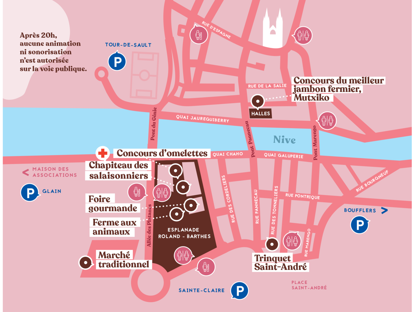 Azken leku aldaketa hori guneen mugaketa berriarekin gertatu zen. Feria bi gunetan iragaten da: Baionako xingar egileak Roland-Barthes zabaldegiko karpa handian bilduak dira eta jaki feria merkatuko plazan.