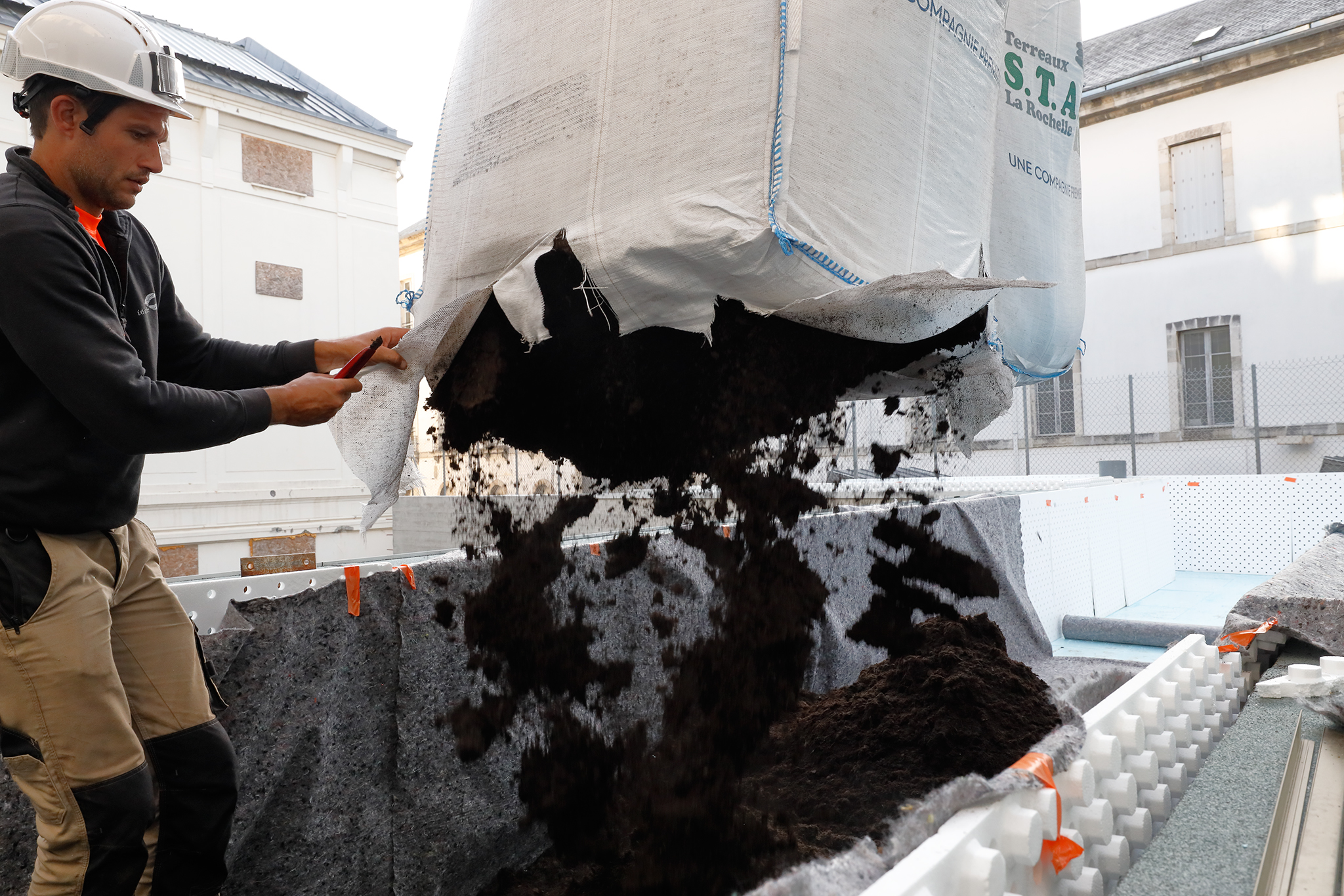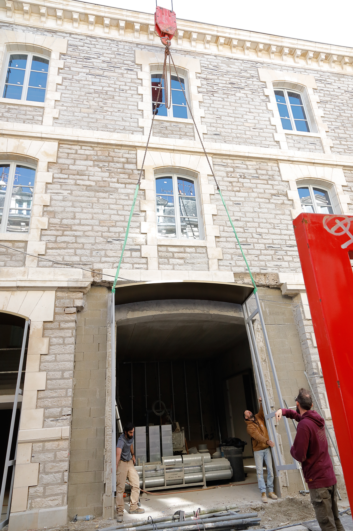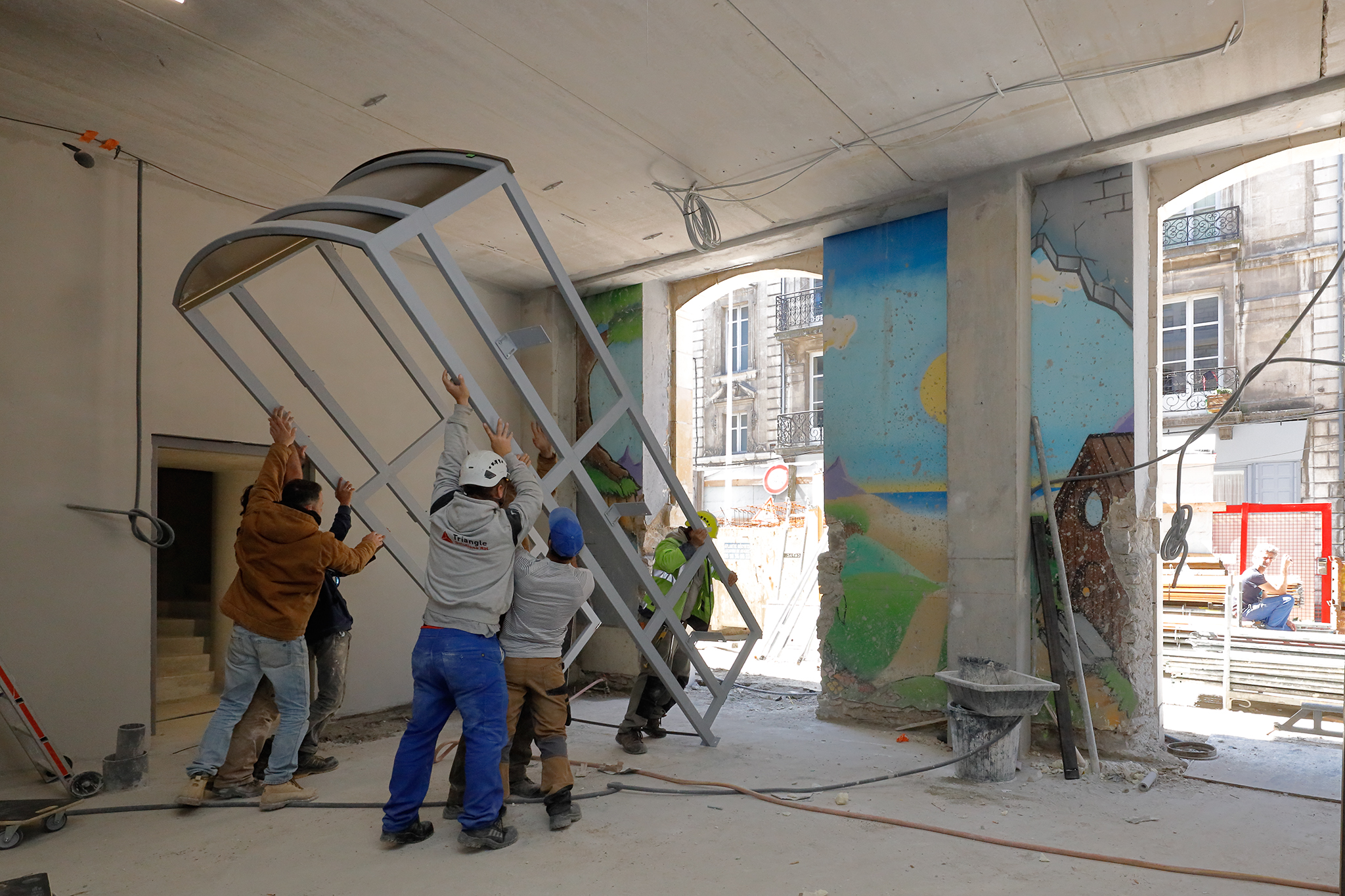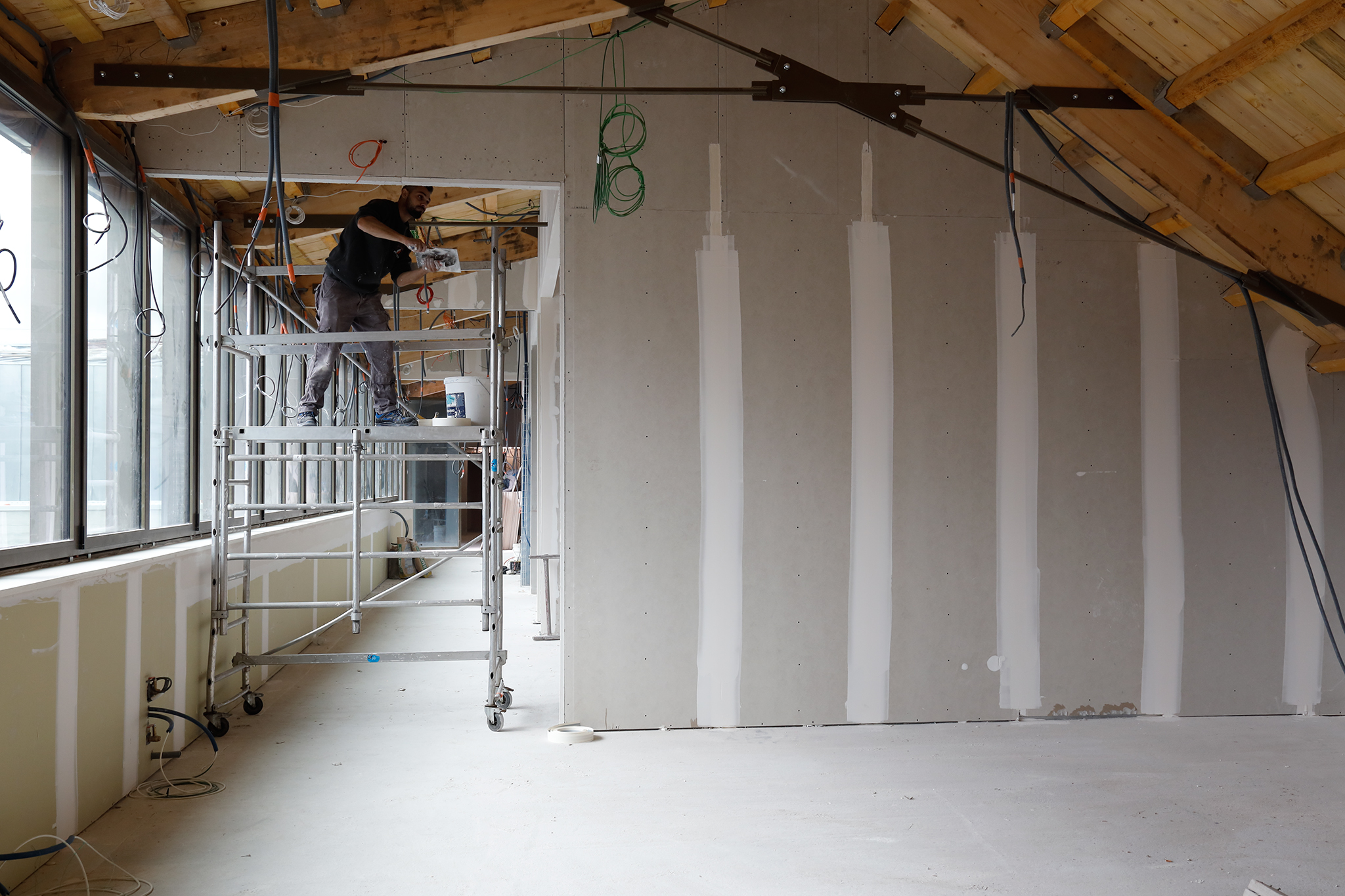 En quelques mois, les travaux d'aménagement intérieurs ont pris forme : raccordement du bâtiment aux puits de géothermie, pose de diverses gaines, de cloisons, de menuiseries, d'un monte-charge, installation de grands bacs de plantation...