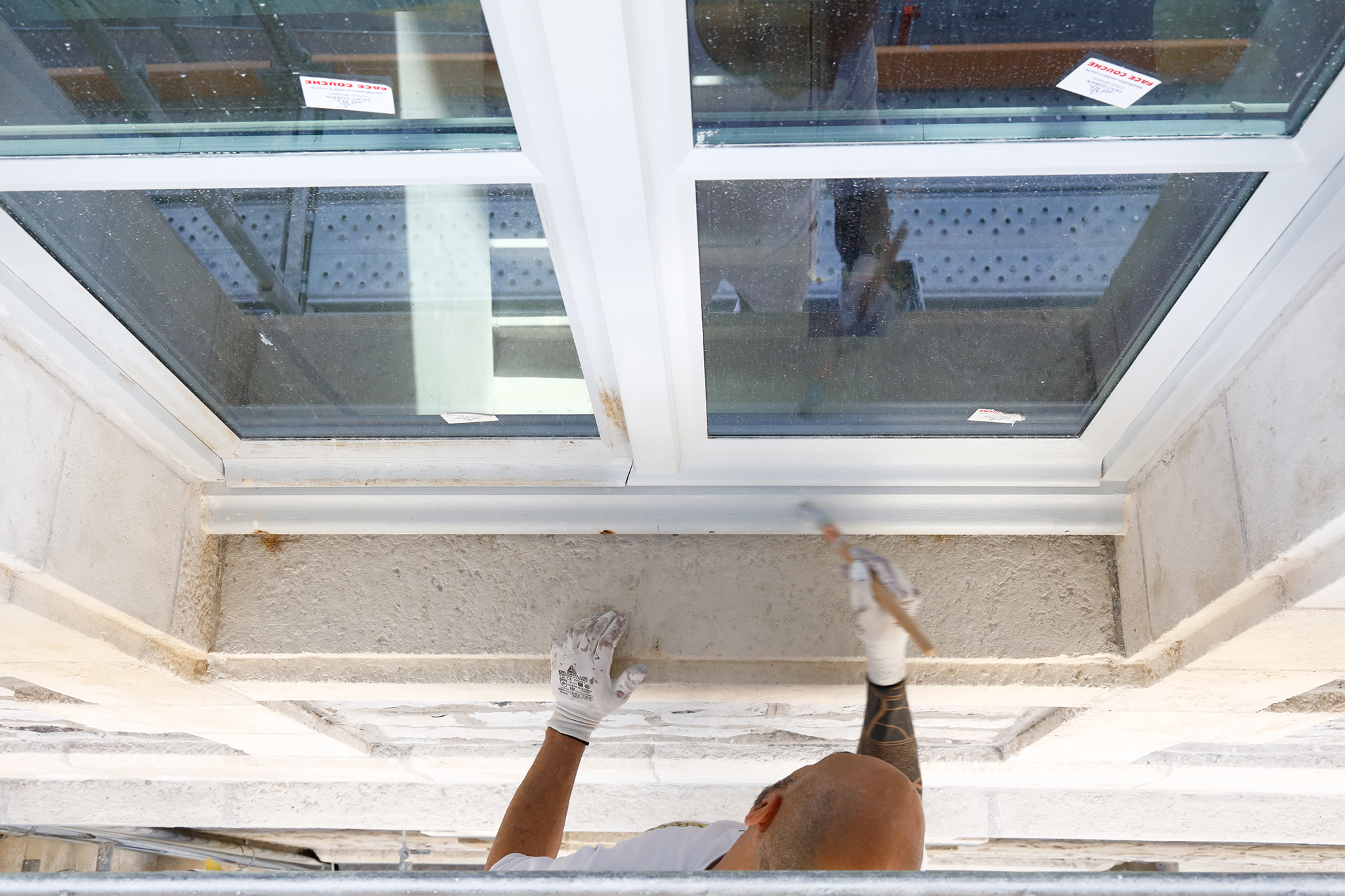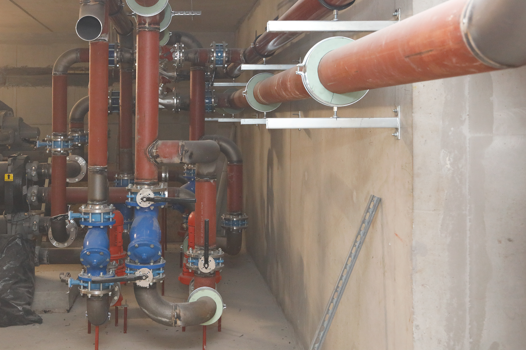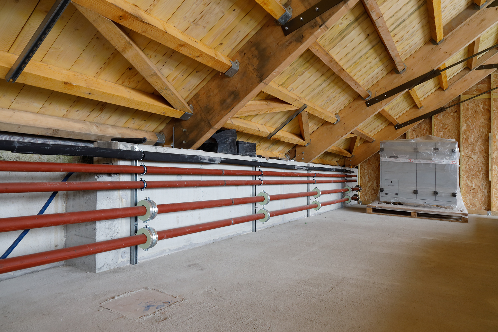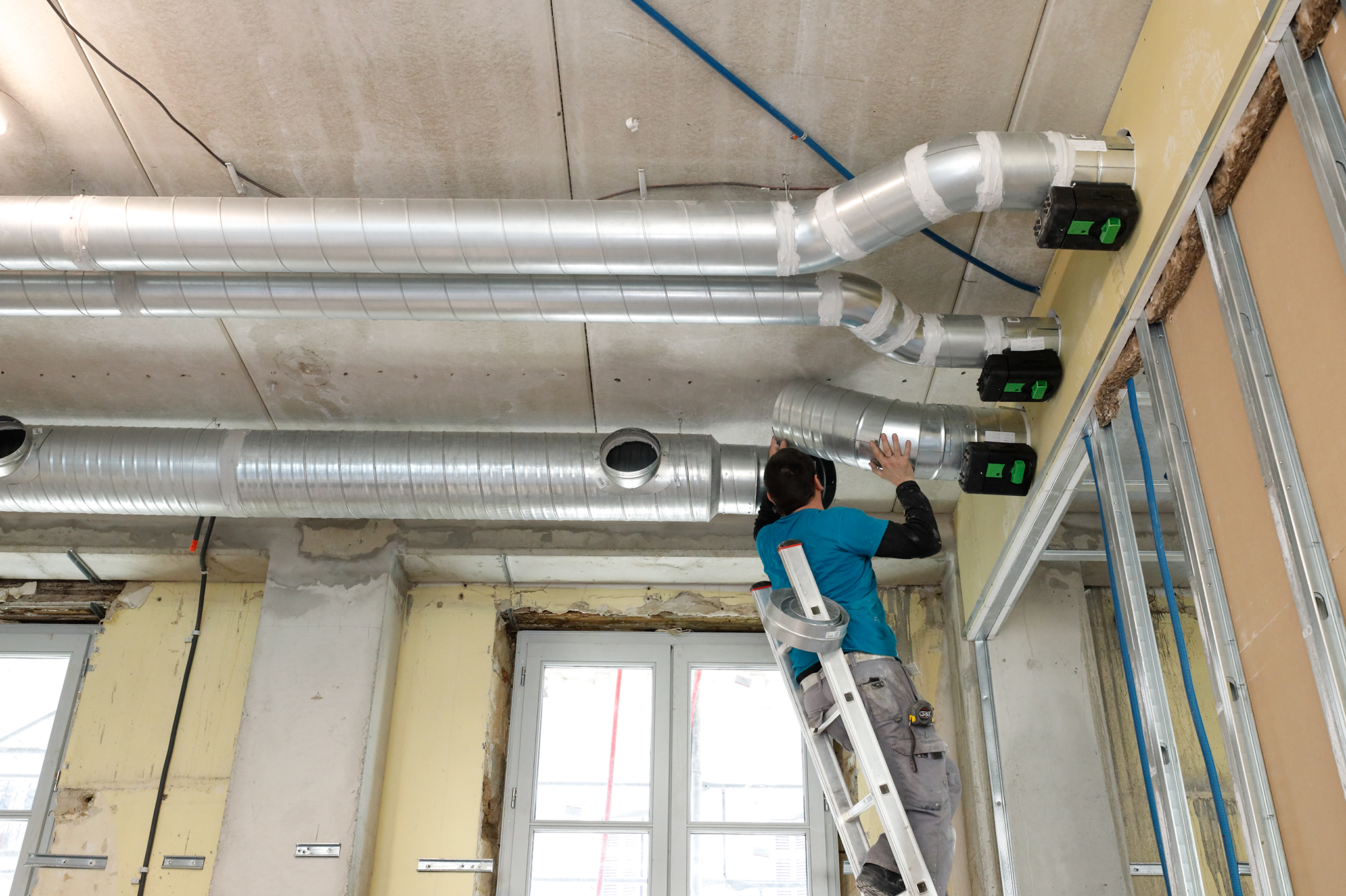 En quelques mois, les travaux d'aménagement intérieurs ont pris forme : raccordement du bâtiment aux puits de géothermie, pose de diverses gaines, de cloisons, de menuiseries, d'un monte-charge, installation de grands bacs de plantation...