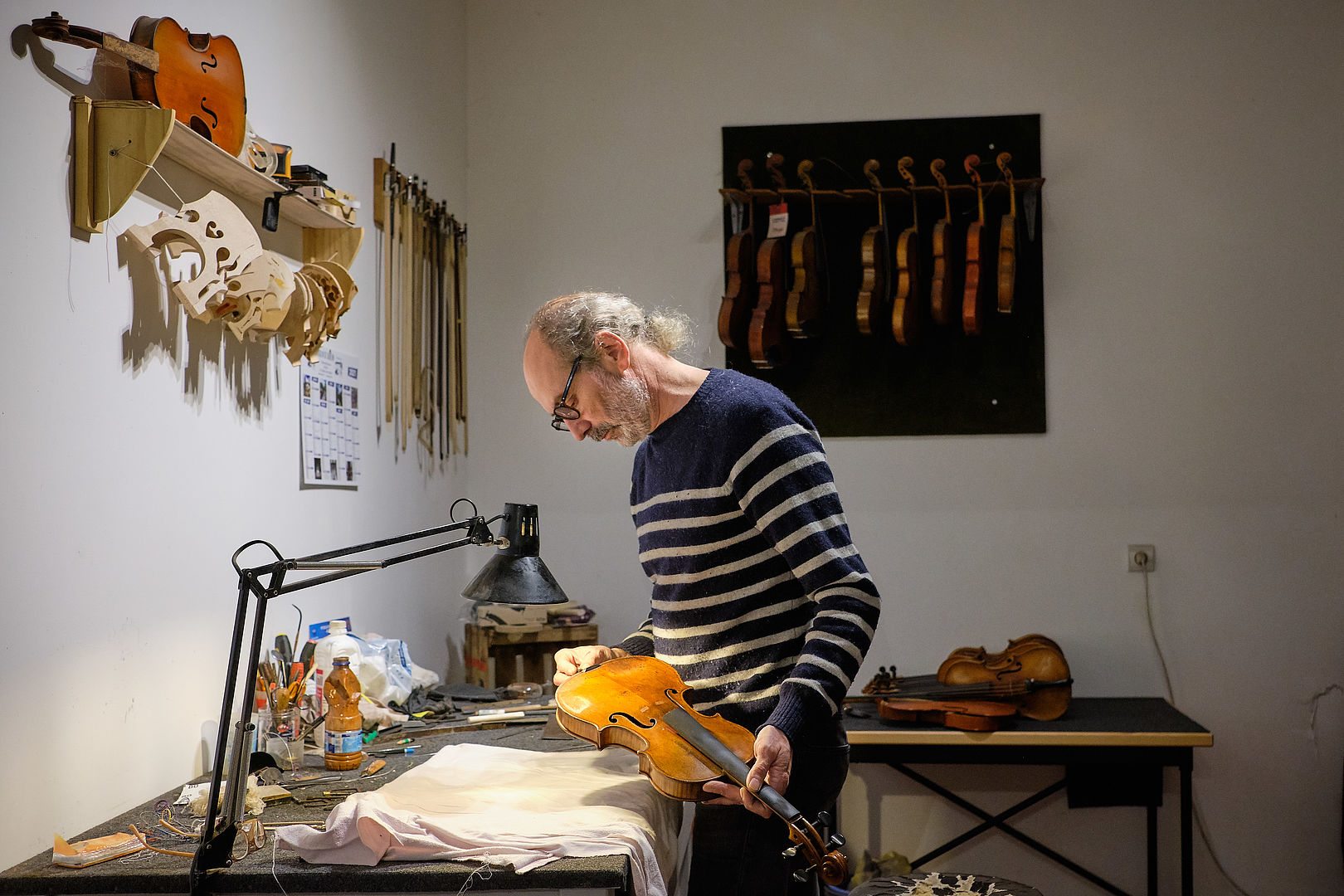 Haren lantegiko berinen gibeletik, katedralaren kalostrapeak lasaitasun goxoa hedatzen du. Irratiak jazz nota goxoak zabaltzen dituen bitartean, Marcelino Herradurak, lan mahaiaren gainean makurturik, kontrabaxu, biolontxelo, biolin eta biolen “hausturak” artatzen ditu, “hari igurtziko musika tresnen kirurgilari bat” bezala, berak dionez. Baionako arrabitagile bakarra da.