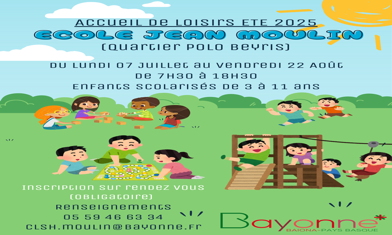 Le centre de loisirs est ouvert de 7h30 à 18h30 du lundi au vendredi. Inscriptions obligatoires sur rendez-vous au 05 59 46 63 34 ou par mail clsh.moulin@bayonne.fr